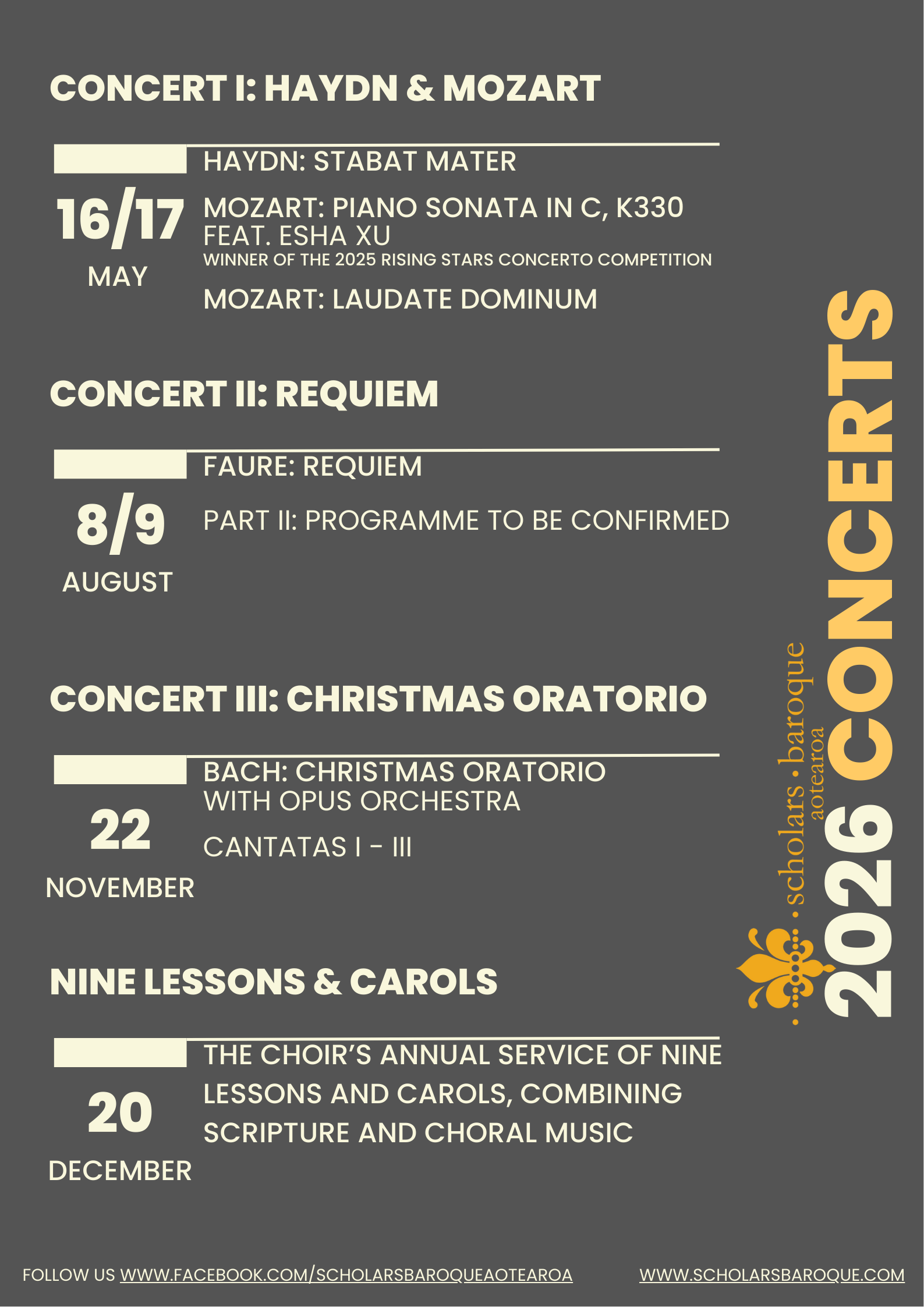 The Scholars Baroque are also pleased to welcome Esha Xu, winner of the Bay of Plenty Symphonia’s 2025 Rising Stars Concerto Competition, performing Mozart’s Piano Sonata No. 10 in C Major, K330. Esha is a captivating and talented performer who enthralled audiences at the concerto competition last year, and the Scholars are excited to share the concert stage with her in their first concert of 2026.